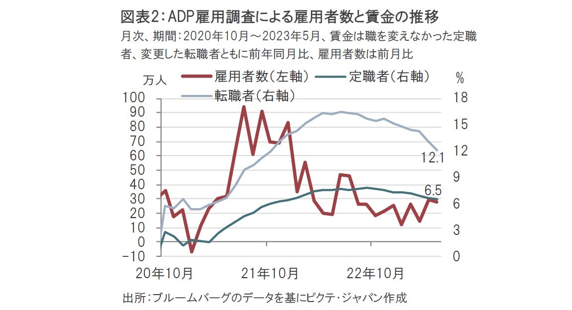 このような局面で発表された雇用関連指標に米国債市場では過度に利上げを織り込む動きが見られませんでした。この背景をADP雇用調査を参照して振り返ります。まず、ADPの雇用者数は5月が前月比27.8万人増と市場予想を大幅に上回りました。しかし反応が限定的であったのは、賃金が落ち着く方向であったからです。特に転職者の賃金が過去の賃金押し上げ要因でしたが、足元減速傾向です(図表2参照)。インフレ率上昇要因として賃金上昇が最も懸念されていますが、ADPのコメントでも賃金上昇圧力は(雇用増にもかかわらず)弱まっていると指摘しています。