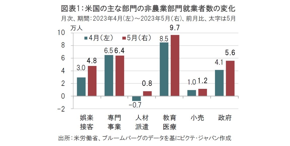 米労働省が2023年6月2日に発表した5月の雇用統計によると、非農業部門の就業者数は前月比33.9万人増と、市場予想の19.5万人増、前月の29.4万人増(速報値25.3万人増から上方修正)を上回りました。部門別で見ても、娯楽・接客、教育・医療、小売、政府など幅広い部門で伸びが確認されました(図表1参照)。