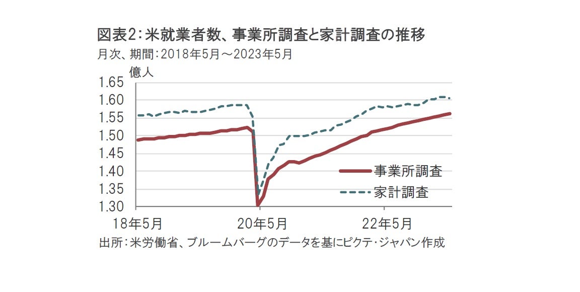 なお、米雇用統計の就業者数は事業所調査が報道などで取り上げられます(図表2参照)。図表2では実線で就業者数を総数で示しています。先ほどの前月比39.9万人の大幅増加は5月と4月の総就業者数の差を示しています。