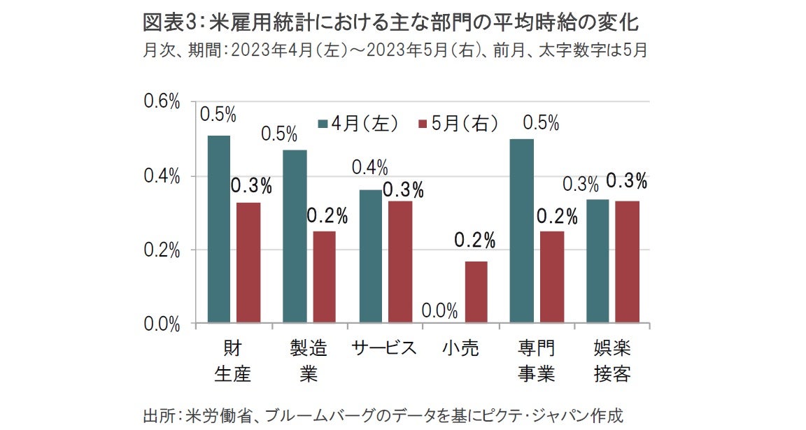 平均時給を部門別に見ても減速感が見られます(図表3参照)。米連邦準備制度理事会(FRB)のパウエル議長などが懸念する住居関連を除いたサービス価格の動向は賃金に左右される傾向がありますが、そのサービス部門全体の平均賃金(時給)は5月が前月比0.3%増で、4月を下回っています。なお、賃金データはこの平均時給だけでなく、幅広く確認する必要がありますが、先日発表された米民間雇用サービス会社ADPのデータでは、賃金上昇の要因でもあった転職者の賃金に減速感が確認されました。