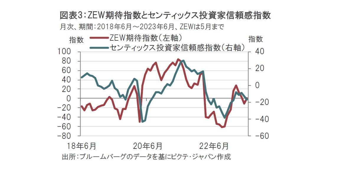 最後に、ユーロ圏の景気の先行きを景況感指数で確認すると、景気回復への期待は勢いが鈍くなっています。ドイツの調査会社センティックスが6月5日に発表したユーロ圏の6月のセンティックス投資家信頼感指数はマイナス17と、市場予想のマイナス15.1、前月のマイナス13.1を下回り、ユーロ圏景気の先行きへの警戒感が強まりました。深刻な景気後退は回避できる可能性はある一方で、ドイツのように形式的には景気後退となっている国もあります。低空飛行が続くものと思われます。