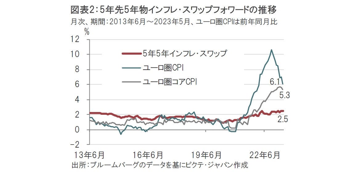 CESはECBが消費者を対象にしたオンライン調査により、期待インフレ率や経済成長率や所得の見通しなどを集計したものです。一方、ECBは市場ベースの5年先から5年間のユーロ圏のインフレ期待を反映する5年先5年物インフレ・スワップフォワードを参照しています(図表2参照)。同レートは足元2.5%前後で高止まりしています。