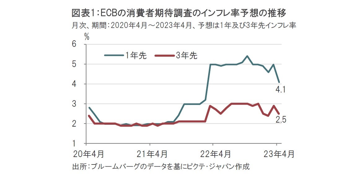 欧州中央銀行(ECB)が2023年6月6日に発表した月次の消費者期待調査(CES)によれば、向こう1年間の期待インフレ率は4月が4.1%と、3月の5%を下回りました(図表1参照)。今後3年間では2.5%と、3月の2.9%から低下し、ECBの中期インフレ率目標である2%へと近づきました。