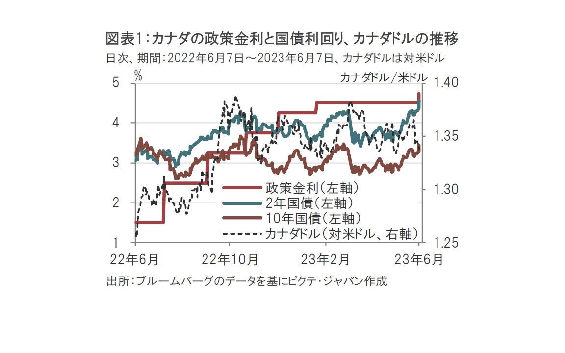 カナダ銀行(中央銀行)は2023年6月7日、政策金利である翌日物金利の誘導目標を4月時点から0.25%引き上げ、4.75%にしたと発表しました(図表1参照)。市場では幅広く据え置きが見込まれていたことからサプライズとなりました。カナダ中銀は23年1月の金融政策決定会合で0.25%の利上げを決定してから、3月、4月の会合では政策金利を据え置いていました。