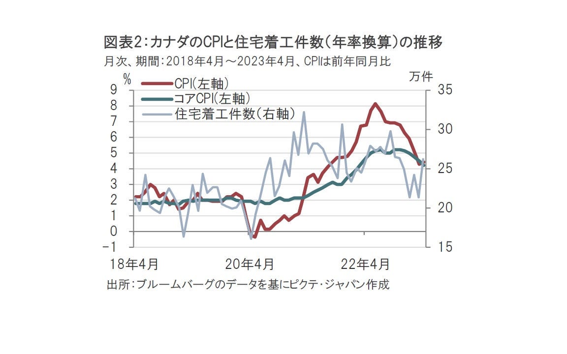 カナダ中銀が指摘する内容を経済指標で確認すると、金利感応度が高い財の代表的な住宅投資を住宅着工件数でみると、4月は約26万件と、前月を大幅に上回っています(図表2参照)。カナダ中銀は住宅市場が足元活況と指摘しています。高金利環境が続いているだけに注意が必要です。