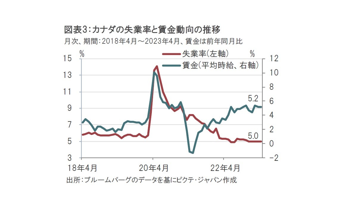 カナダは25年に移民の受け入れ人数を21年より23%多い年間50万人に増やす計画が最近報道されるなど、労働者不足に直面しています。移民を増加させてはいるものの、カナダの失業率は4カナダは25年に移民の受け入れ人数を21年より23%多い年間50万人に増やす計画が最近報道されるなど、労働者不足に直面しています。移民を増加させてはいるものの、カナダの失業率は4月が5%と、昨年12月から同水準で、22年6月の4.9%に迫る低水準で推移しています(図表3参照)。失業率がコロナ禍前の水準を下回る一方で、平均時給は前年同月比で4月分が5.2%増とコロナ禍前を上回っています。今年1月25日の金融政策決定会合では、0.25%の利上げを決定するも、全般的な経済活動の鈍化を指摘しました。そのうえで、再利上げの可能性に言及しつつ、据え置きを示唆し、3月と4月の2会合は据え置きとなりました。過去の利上げの効果を見守るというのが、据え置きを支持する理由でした。おそらく、その当時は賃金の伸び鈍化も期待していたと思われます。しかしながら、賃金がなかなか下がらない足元の状況が今回の会合で再利上げを決定したひとつの要因と思われます。