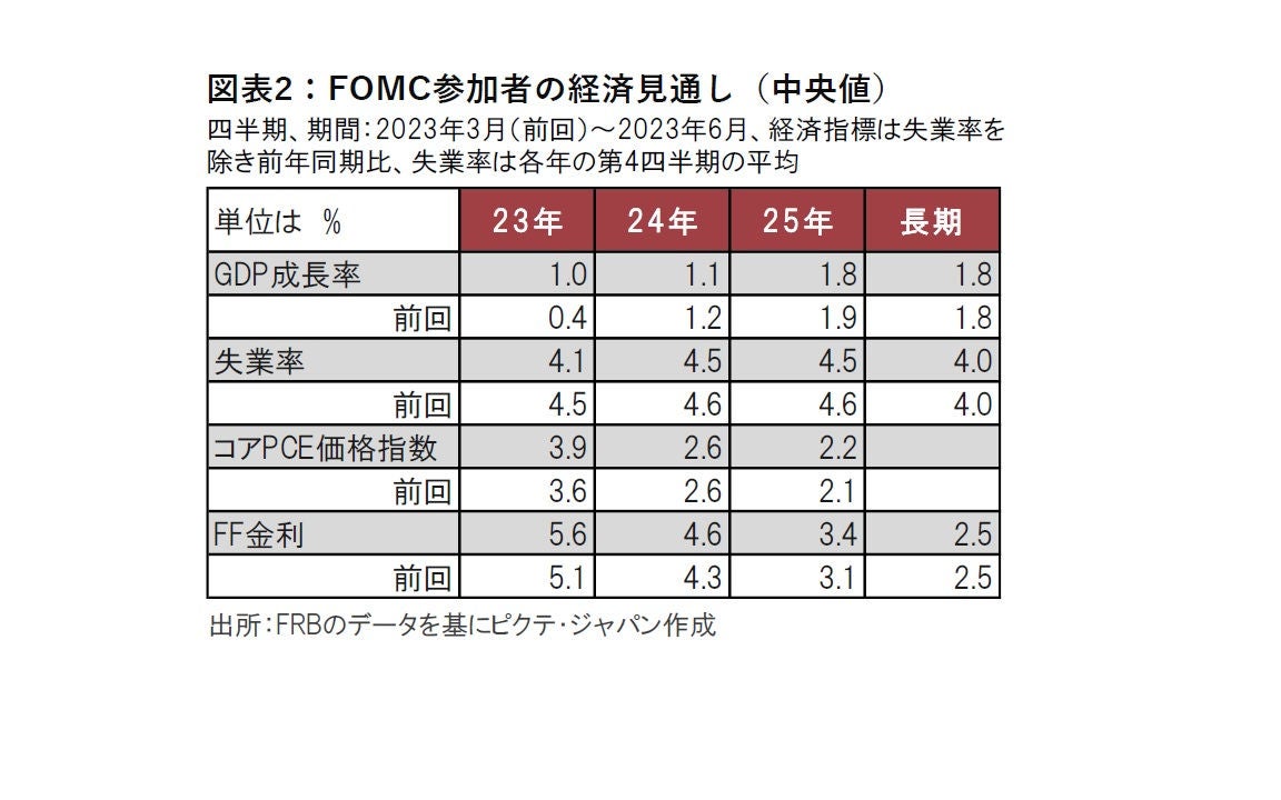 6月のFOMCは市場予想通りタカ派的な政策金利の据え置きとなりました。ただし、FOMCの発表内容の中には、年内の利上げ見通しが1回でなく2回であったことや、23年のGDP(国内総生産)成長率やコア個人消費支出(PCE)価格指数などが前回のFOMCから上方修正されました。政策金利の指標であるフェデラルファンド(FF)金利の23年年末水準の見通しは5.6%と0.25%の利上げ2回分引き上げられています(図表2参照)。