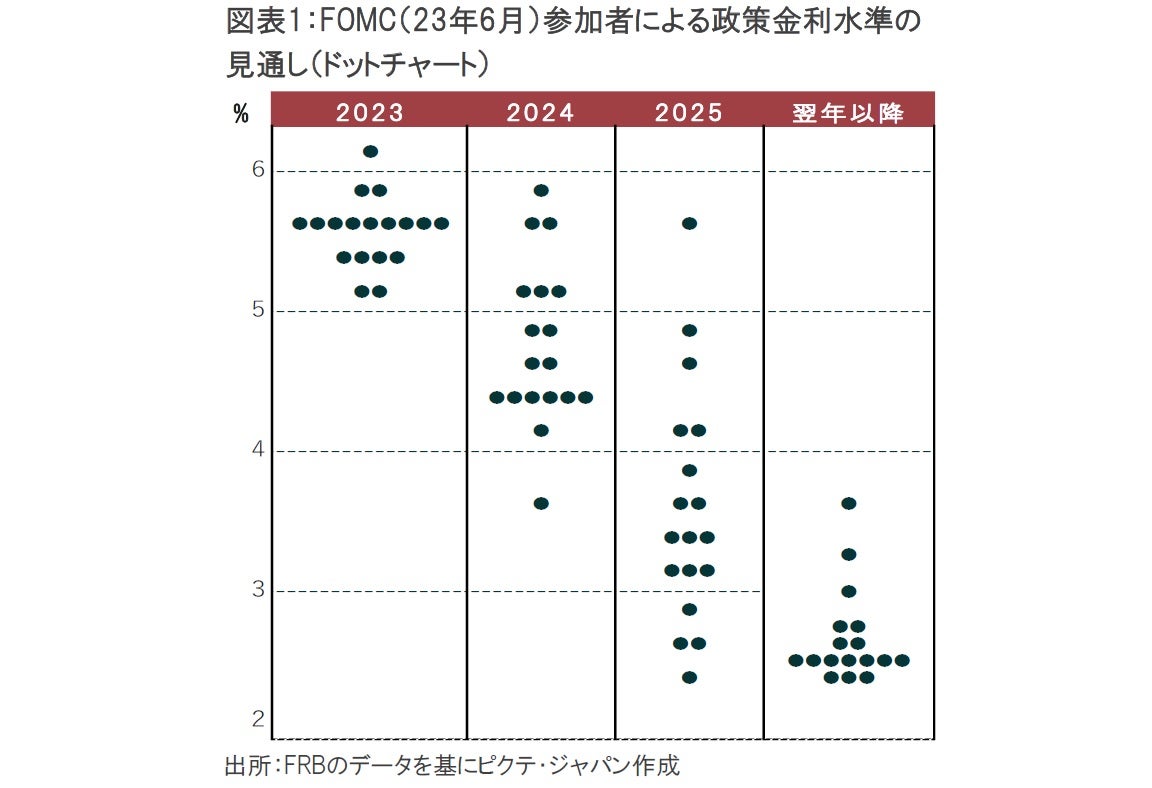 同時にFOMCの経済見通しや米政策金利見通し(ドットチャート、図表1参照)が発表され、ドットチャートは23年内であと2回程度の利上げが示唆されるなどタカ派(金融引き締めを選好)的でした。