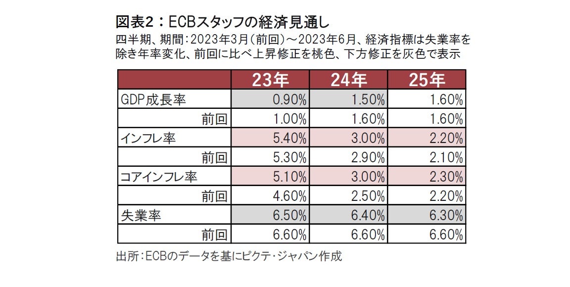 6月のECBの理事会で政策金利は市場予想通りに引き上げが決定されました。量的緩和策(APP)の7月再投資終了や、パンデミック緊急購入プログラム(PEPP)を少なくとも24年末まで柔軟に再投資継続する方針などは既定路線通り維持されました。想定通りが多かった今回の理事会の中で、あえて注目点を探すならば、追加利上げが示唆され、それと整合性のとれたECBスタッフによる経済見通しが発表されたことです(図表2参照)。