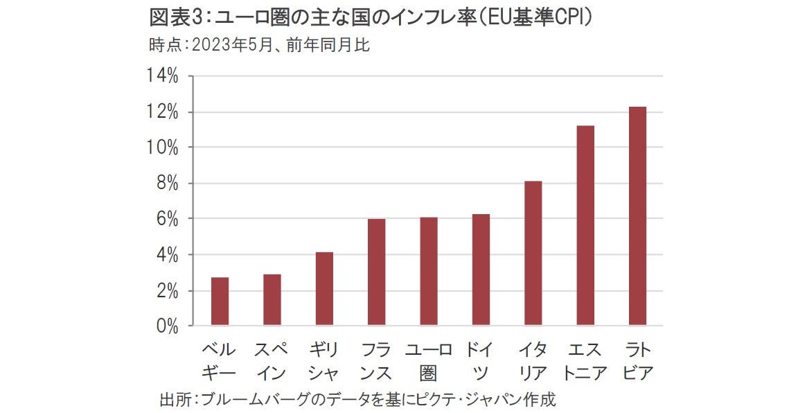 また、利上げを決めた今回の理事会が全会一致でなかったことも気がかりです。ラガルド総裁は会見で全会一致かを問われ、調和のとれた会議で、大まかなコンセンサスが取れたと、苦労が表れている表現をしています。何を調和させたのかはわかりませんが、ユーロ圏を構成する国のインフレ率にはばらつきがあります(図表3参照)。東欧のラトビア、エストニア、スロバキアなどは2桁のインフレ率に直面しています。一方で、ギリシャやスペインなど数字の上ではインフレが収まりつつある国もみられます。今回の理事会前にギリシャ中央銀行のストゥルナラス総裁は利上げはあと1回か2回と早期の利上げ終了を支持していました。ラガルド総裁の会見でも9月以降の利上げの方針がやや明確でないのは、ある程度の配慮があったのかもしれません。