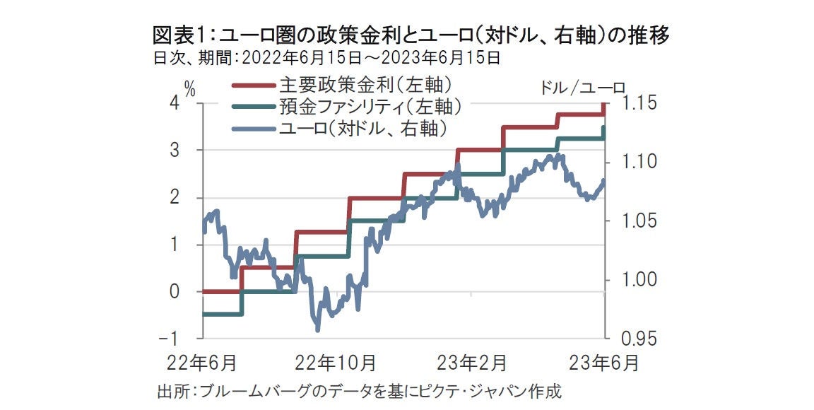 欧州中央銀行(ECB)は2023年6月15日の理事会で、前回5月と同じ利上げ幅となる0.25%の利上げを決めました。利上げは市場予想通りで、主要政策金利を4.00%、銀行が中央銀行に預ける際の金利(預金ファシリティ)を3.50%としました(図表1参照)。