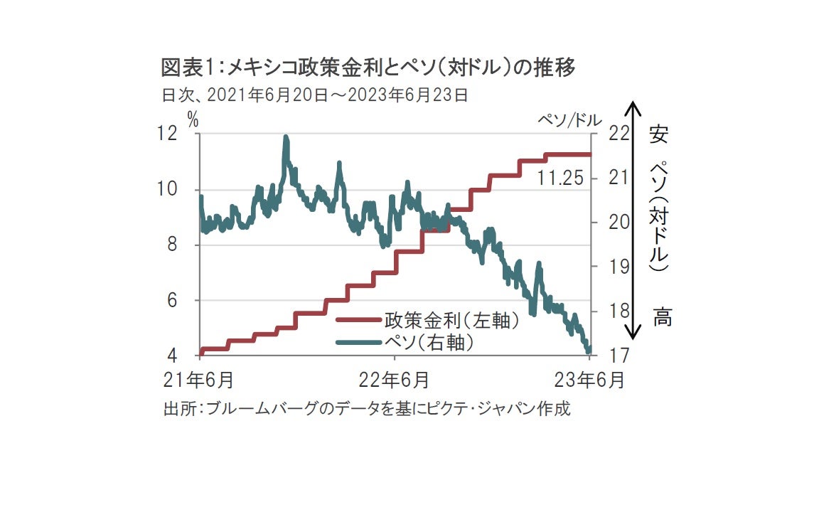 メキシコ銀行(中央銀行)は2023年6月22日、金融政策決定会合を開催し、市場予想通り政策金利を11.25%で据え置くことを発表しました(図表1参照)。メキシコ中銀は21年6月に利上げを開始し、前回会合(5月)で据え置きに転じており、利上げを停止した前回から2会合連続で据え置きとなりました。今回の決定は全会一致(メキシコ中銀の委員は5人)でした。