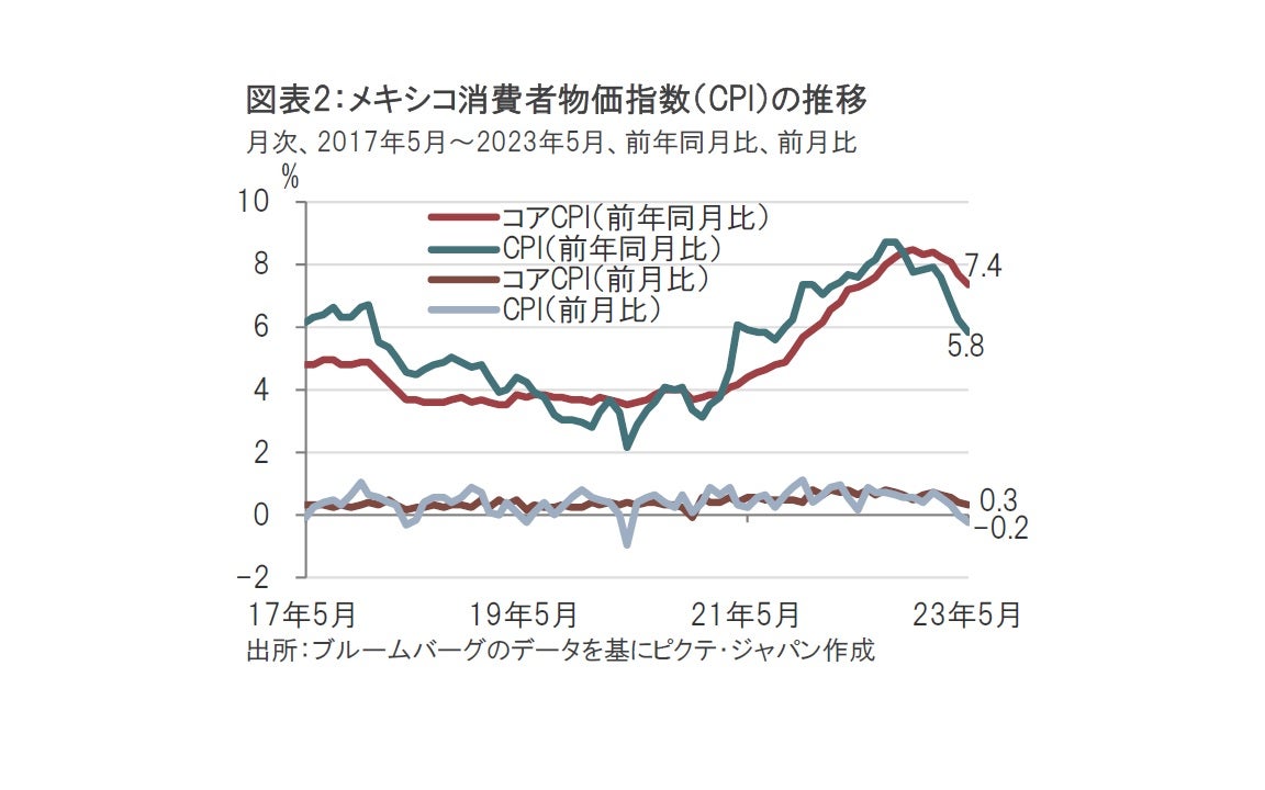 水準を語るうえで大切なのはインフレ率で調整した実質金利が大幅なプラスとなっている点です。メキシコの消費者物価指数(CPI)は5月が前年同月比で5.8%上昇と、ピークアウト感は明確ながら、物価目標(CPIで3%±1%)を上回っています。そのため、メキシコ中銀は金融引き締め姿勢を維持している点は市場に評価されているとみられます。なお、メキシコ中銀のインフレ見通しによると、物価目標の上限4%を下回るのは24年4-6月期と5月の会合時点と変わりなく、インフレに対して慎重な見方を維持しています。