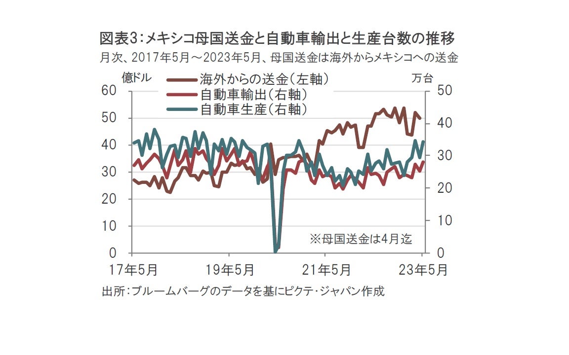 メキシコ景気が底堅いこともペソ高要因と思われます。メキシコの経済成長見通しは年初低水準でしたが、経済的に結びつきが強い米国経済が底堅かったことから、海外(主に米国)からメキシコへの送金は予想外に堅調に推移しています(図表3参照)。また、主力産業の自動車生産も輸出の回復に伴い上昇傾向となっています。