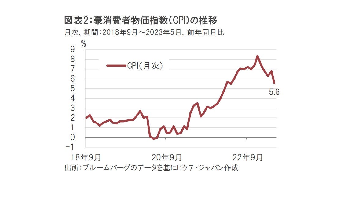 豪中銀は7月の理事会の声明文で、豪インフレ率はピークアウトは明確だが、物価目標(2%から3%の間)を大幅に上回っていると指摘しています。月次の消費者物価指数(CPI)で豪のインフレを確認すると5月分は前年同月比で5.6%上昇と、前月の6.8%上昇を大幅に下回りました(図表2参照)。市場でも6月28日に発表されたこの6月のCPIにより今回の理事会での据え置き予想が優勢となった感があります。豪中銀の金融政策を占ううえで、インフレ動向は当然のことながら最も注目される指標と思われます。