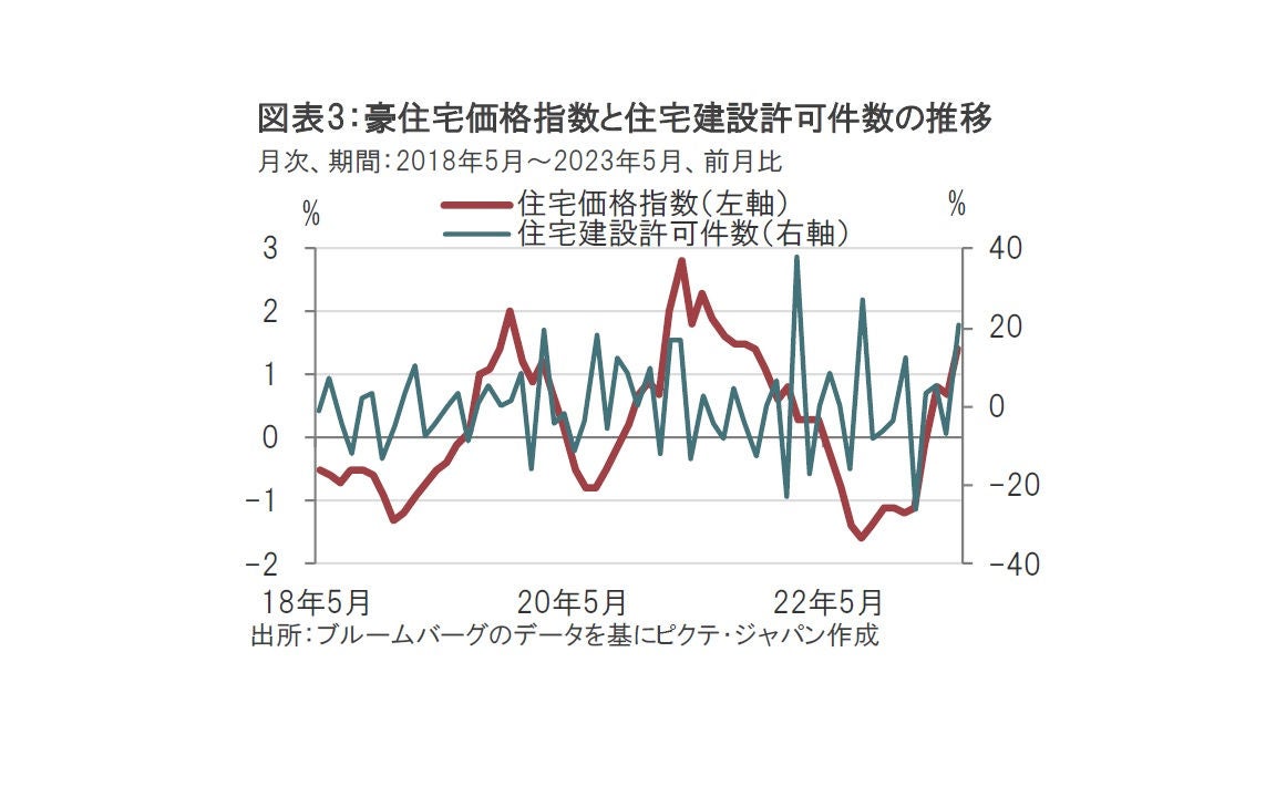物価以外に注目すべき指標をいくつか確認します。まずは住宅市場です。豪中銀は22年5月から利上げを開始し、今年4月に政策金利を3.60%で据え置きました。しかし、5月、6月と追加利上げに転じる展開となっています。4月に据え置きに転じたのは住宅市場などの回復鈍化が背景とみられます。例えば住宅建設許可件数は年初から前月比で軟調な推移となっていました(図表3参照)。しかし、同指数は5月に前月比20.6%と急回復しています。金利上昇を意識した駆け込み需要なのかもしれませんが、物価抑制に必要な金利上昇を妨げる要因として不動産市況を過度に懸念することはないように思われます。