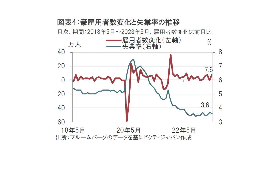 インフレ動向を占ううえで豪中銀が注目するのは雇用関連指標とみられます。今回の声明文でも、豪雇用市場は引き続き非常にタイトであるとの認識を示すとともに、労働コストと企業の価格設定の動向を引き続き注視すると指摘しているからです。最近の豪雇用関連指標を確認すると、5月の失業率は3.6%と低水準で、雇用市場の堅調さが示されています(図表4参照)。これは失業率がコロナ禍前の水準を大きく下回ることからも明らかです。また、雇用者数も堅調に推移しており、5月は前月に比べて約7.6万人増となりました。今回の理事会で利上げを予想していた市場参加者は雇用関連のデータを重視したように思われます。