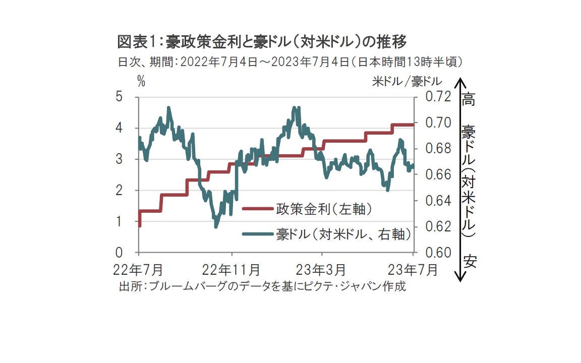 オーストラリア(豪)準備銀行(中央銀行)は2023年7月4日の理事会で、政策金利を過半の市場予想通り4.10%に据え置くことを決定しました(図表1参照)。市場では0.25%の利上げも見込まれていましたが年4.10%に据え置かれました。利上げが見送られたことで、為替市場では政策金利の発表直後は豪ドル安が進行しました。