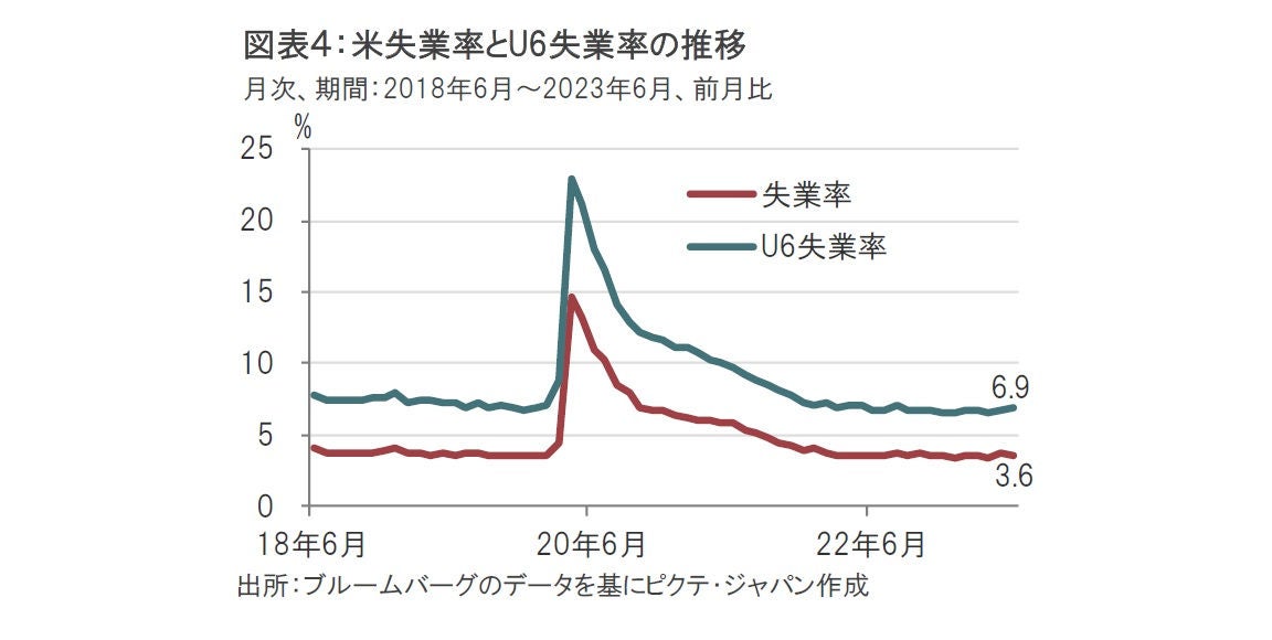 6月の米雇用関連統計で底堅さを見せたのが失業率の3.6%への低下です。5月は3.7%と4月の3.4%から急上昇しましたが、いったん落ち着いた格好です(図表4参照)。家計調査で失業率算出の項目を確認すると、6月の就業者数は27.3万人程増加(事業所調査の数字とは異なる)した一方で、失業者数は前月比で約14万人減少しています。数字では雇用の強さがうかがわれます。