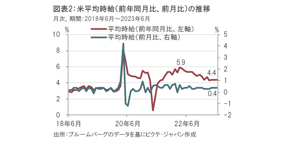 7日の6月米雇用統計に先立ち発表された他の雇用関連指標が概ね堅調であったことから注目度が高まった今回の雇用統計では、非農業部門の就業者数が市場予想を下回りました。しかし平均時給は高止まり傾向であるなど、米労働市場の堅調さも示されています(図表2参照)。