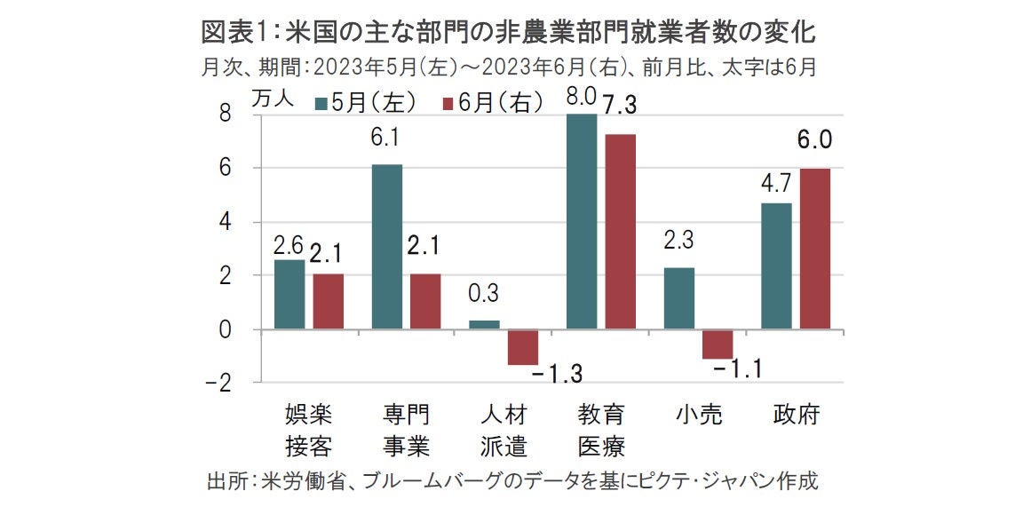 米労働省が2023年7月7日に公表した6月の雇用統計によると、非農業部門の就業者数は前月比20.9万人増と、市場予想の23万人増、前月の30.6万人増を下回りました。部門別の就業者数の伸びでは、教育・医療や政府、図表にはありませんが建設などといった部門で増加がみられました(図表1参照)。一方、小売りや、人材派遣、運輸・倉庫などで雇用が減少しました。