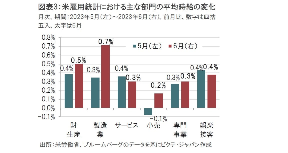 もっとも、平均時給の短期的動向を前月比で部門別にみると注意点も浮かび上がります(図表3参照)。例えば、6月の平均時給をけん引した部門の一つは製造業の前月比0.7%の上昇ですが、このペースはやや高いとみられます。部門別の平均時給は変動が大きいケースもあり注意が必要です。一方、小売りや娯楽・接客など非農業部門就業者数の7割程度を占めるサービス部門の平均時給は0.3%の上昇で、5月の0.4%上昇を下回っています。米連邦準備制度理事会(FRB)が賃金動向で注目しているのは主にサービス部門であると思われます。全体の平均時給が前月比0.4%上昇と市場予想の0.3%上昇を上回った点だけに注意を払いすぎないことも必要と考えます。