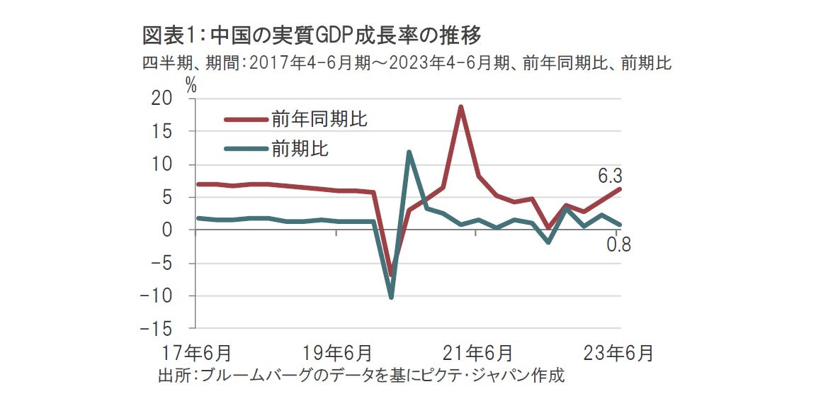 中国国家統計局が2023年7月17日に発表した23年4-6月期の実質GDP(国内総生産)成長率は、前年同期比で6.3%増と、市場予想の7.1%増を下回りました(図表1参照)。前期の4.5%増は上回りましたが、昨年の4-6月期の実質GDP成長率は上海がロックダウン(都市封鎖)となっていた影響などにより前年同期比で0.4%増と成長率が落ち込んでいた時期でもあり、今期はその反動が大きいとみられます。