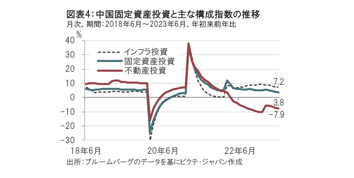 中国の6月の経済指標の中には工業生産や固定資産投資のように(図表4参照)、市場予想を上回る指標も見られました。6月の工業生産は前年同月比4.4%増と、市場予想の2.5%増を上回り、固定資産投資も年初来前年比が3.8%増と、市場予想の3.4%増を上回りました。これらの生産関連指標は4月、5月と市場予想を上回ることはなかっただけに、6月に安定化の兆しが見られました。特に前期比で見て、4-6月期のGDP成長率の伸びは鈍化しましたが、月次指標からは6月に持ち直しの兆しも含まれています。