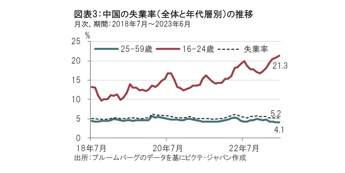 より深刻なのは消費のけん引役が期待される若年層の失業率が上昇傾向なことです(図表3参照)。中国の若年層の失業率が高い背景として、高学歴化が進む一方でそれに見合う就職口が少ないことや、雇用調整に若年層がターゲットとなっていることなど様々な要因が指摘されています。ただ要因の決め手は定まっておらず、おそらく複合的な構造問題が原因と思われます。その場合、この問題にも当局の対応が求められそうです。