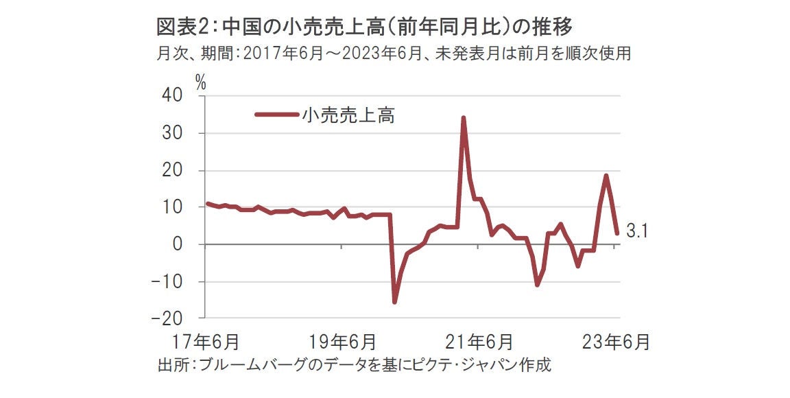 中国の4-6月期GDP並びに同日に発表された月次の主要経済指標から中国景気にゼロコロナ政策終了に伴う経済再開の勢いの鈍化がみられました。月次データでは6月の小売売上高が前年同月比で3.1%増と、市場予想の3.3%増を小幅ながら下回り、前月の12.7%増を大幅に下回りました(図表2参照)。生産活動の指標は6月に安定化を示しましたが、持続性などに不安も残ります。中国当局の対応策が待たれるところです。
