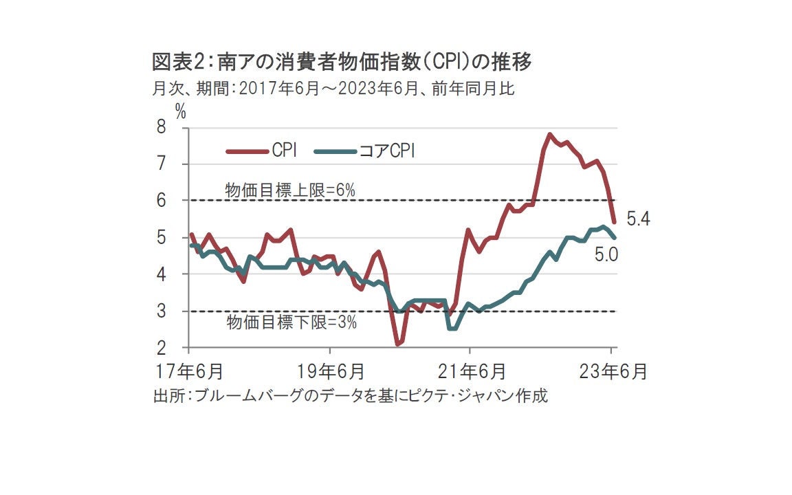 次に南アの消費者物価指数(CPI)の低下が挙げられます。6月のCPIは前年同月比で5.4%上昇、変動の大きい項目を除いたコアCPIは5.0%上昇と、共に前月を下回りました。