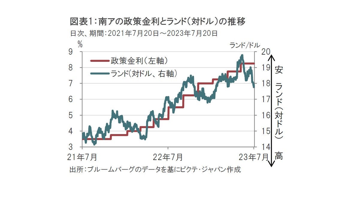 南アフリカ準備銀行(中央銀行)は2023年7月20日の金融政策決定会合で、過半の市場予想に反し、政策金利を8.25%で据え置くことを決定しました(図表1参照)。市場では0.25%の引き上げが見込まれていました。