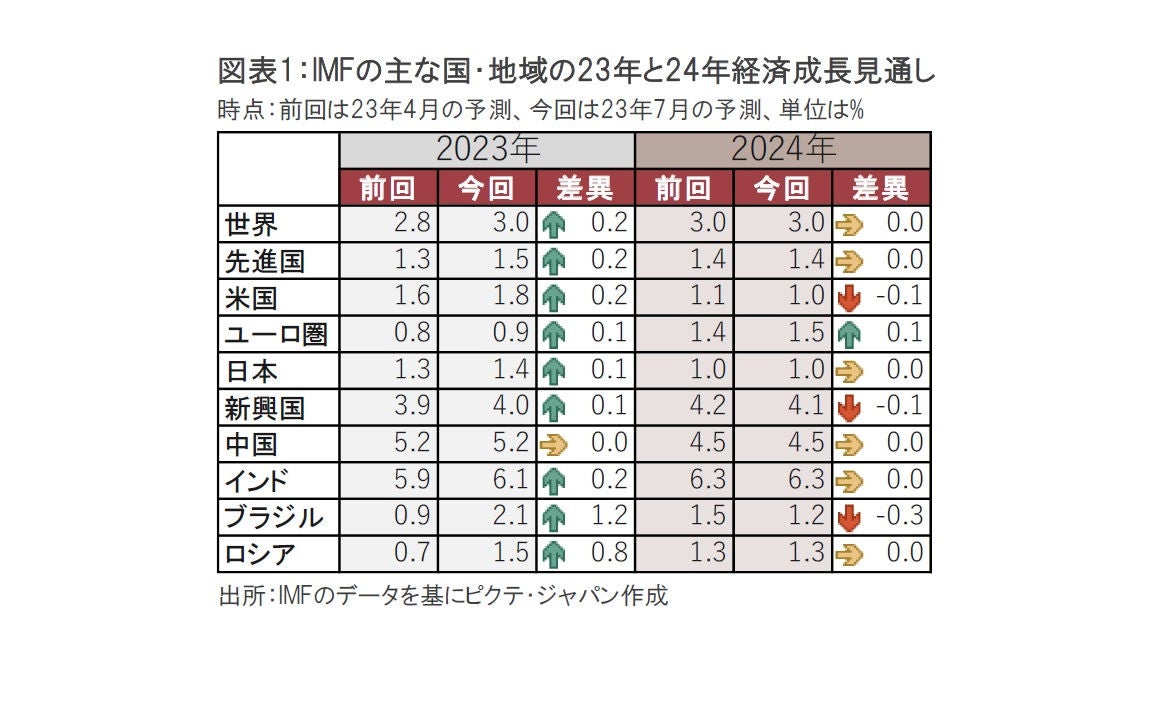 国際通貨基金(IMF)は2023年7月25日に3ヵ月に1度更新する世界経済見通しを公表しました(図表1参照)。IMFは今回、23年と24年の成長率を共に3.0%としましたが、23年は前回(4月)の見通しである2.8%から上方修正しました。もっとも、3.0%という成長率は2000~2019年までの長期的な平均成長率(3.8%)を下回っています。