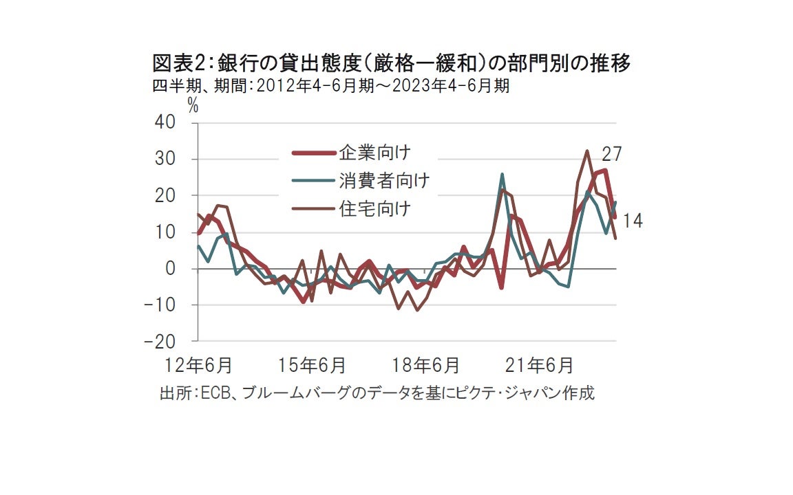 次に、ユーロ圏をみると、23年の成長率は0.1%上方修正されています。サービス、とりわけコロナ禍の収束により観光産業が堅調なことが背景で、恩恵を受けたとみられるイタリアが0.4%、スペインは1.0%上方修正されました。反対に製造業は不振で、ドイツは今年マイナス成長が見込まれています。来年は観光の伸びは頭打ちな一方で、製造業の改善期待でドイツの回復が予測されています。もっとも、ユーロ圏のインフレ動向が深刻な中、金融引き締めが景気を押し下げないか注意も必要です。25日に欧州中央銀行(ECB)が発表した最新の銀行貸出調査をみても、銀行の企業や家計向け(消費者並びに住宅)貸出態度は平均より引き締め水準です。企業向け貸出態度(厳格ー緩和の割合)をみると、金融不安で急速に引き締め姿勢が強まった1-3月期の27%から14%に緩和してはいますが、貸出態度の長期的平均である9%を依然上回っています。ECBの金融引き締めが長期化すれば銀行の貸出態度は厳格化する可能性もあるだけに、今後の展開に注意が必要です。