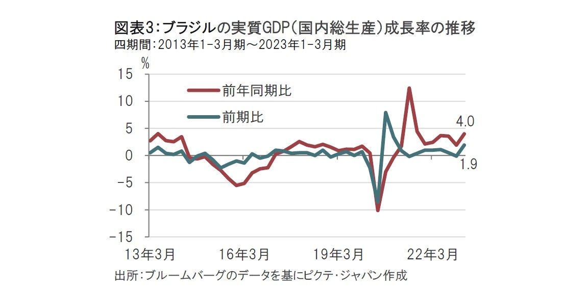 次はブラジル経済です。ブラジルの実質GDP(国内総生産)成長率は1-3月期が前年同期比4.0%増と前期の1.9%増を大幅に上回りました(図表3参照)。前期比でも1-3月期は1.9%増と前期のマイナス0.2%から急上昇しています。1-3月期の成長率は数字だけ見ればブラジル景気に心配はないようにも思えます。しかし内容を見ると、1-3月期の回復は前年同期比で18.8%増となった農業など、特定の産業に持続性のない成長がみられました。一方で、金利感応度の高い建設は1.5%増、製造業はマイナス成長に転じるなど先行きに不安が残ります。年後半のブラジルの成長予想を市場のコンセンサスで見ると、1%台が見込まれています。物価政策には直接関係ないとしても、引き締め過ぎが懸念される水準に近づいていたようです。