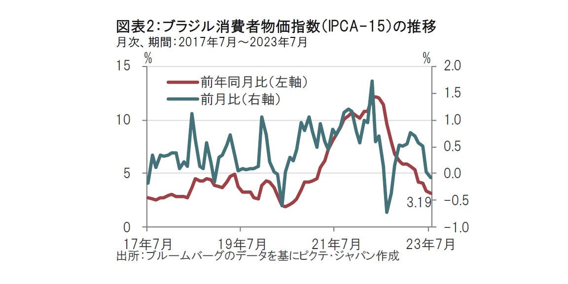 まずブラジルの物価動向を確認します。前月半ばから、当月15日締めとなる7月の消費者物価指数(IPCA-15)は前年同月比が3.19%上昇と前月の3.40%上昇を下回り、ブラジル中銀の足元の物価目標(3.25%±1.5%)の中央値とほぼ並びました(図表2参照)。インフレ率は数字の上では、利下げ開始に何ら不思議のない水準です。