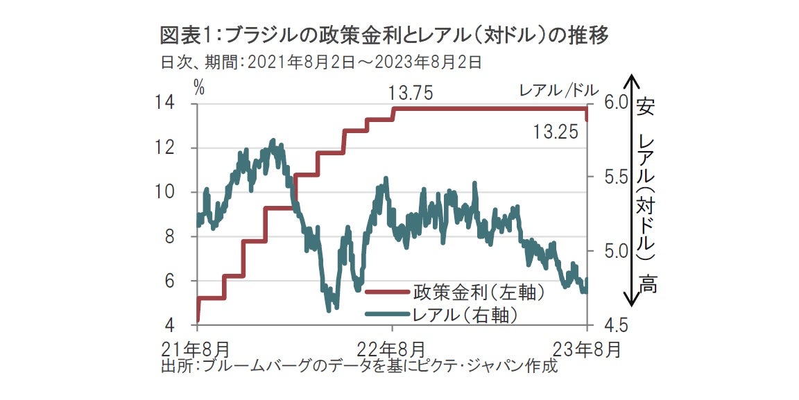 ブラジル中央銀行は2023年8月2日に開催した金融政策決定会合(COPOM)で、大半の市場予想(0.25%の利下げ)に反し、政策金利を0.5%引き下げて13.25%にすることを決定しました(図表1参照)。ブラジル中銀は21年3月に利上げを開始し、合計11.75%引き上げました。