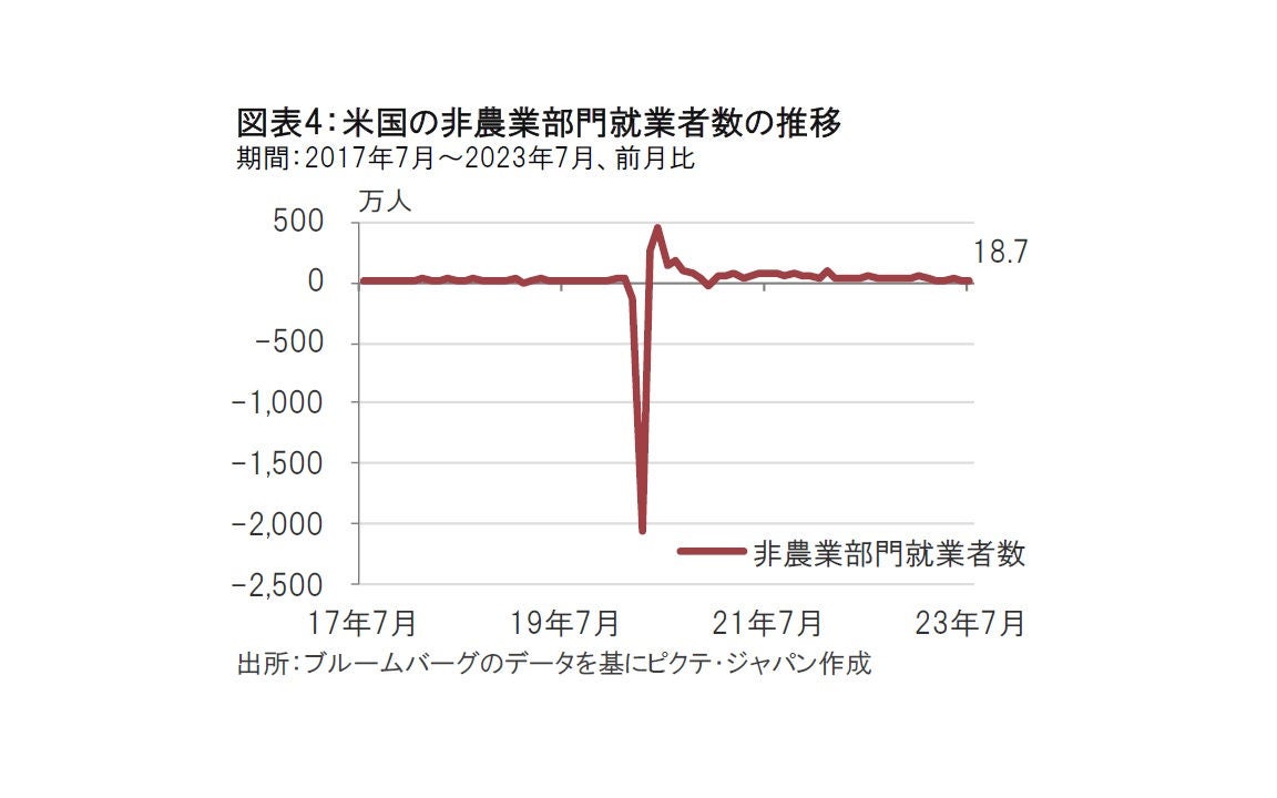 8月の雇用統計では非農業部門の就業者数(図表4参照)、平均時給(賃金)、失業率に注目が集まりそうです。非農業部門の就業者数に関連する報道として、米労働省が発表した年次ベンチマーク改定があります。発表によると23年3月までの1年間の就業者数増は約30.6万人下方修正される模様です。今回の修正で昨年3月から今年3月までのデータに適用されますが、最近の就業者数の速報値データは下方修正されるケースが増えています。今回の場合、7月データの修正方向に注目しています。