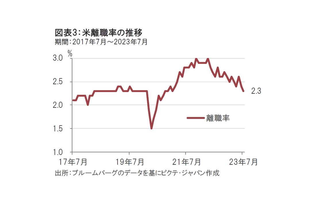 次に、自発的離職者の割合により労働市場の活況度を示唆するとみられる離職率は7月が2.3%と、前月の2.4%を下回りました(図表3参照)。離職率が高い場合は労働市場での職の探しやすさの目安とみられます。現状は仕事を探しにくいと感じる人が増えているようです。自発的な離職者が多く、離職率が高まると、雇用確保に向け企業が賃金を上げる傾向があると考えられます。今後の賃金動向への影響が注目されます。