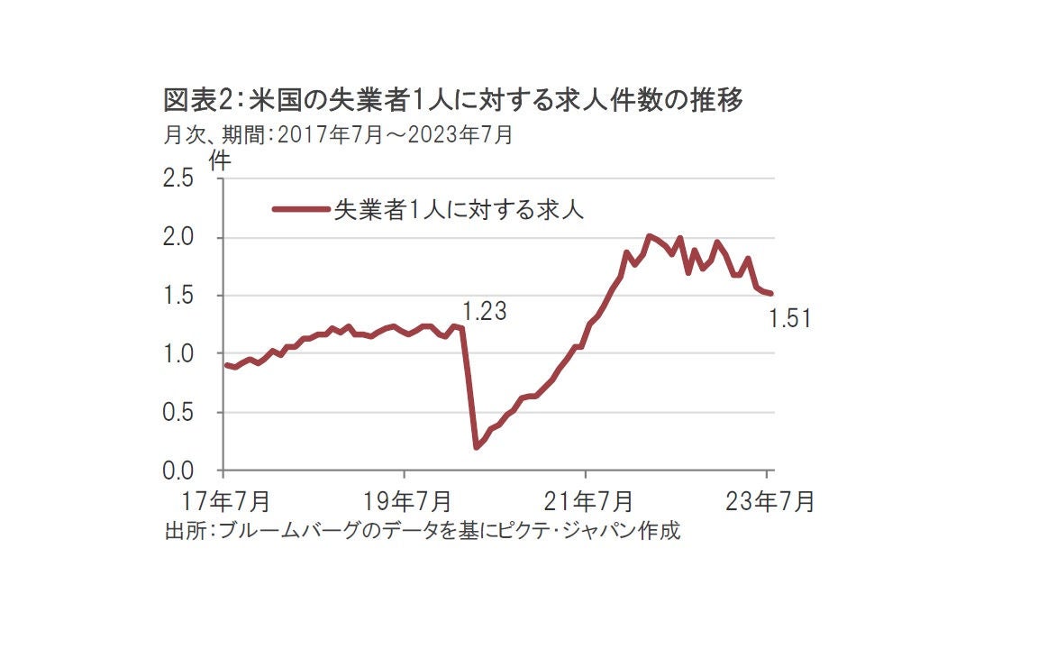 まず、7月の求人件数は前月に比べ大幅減となりました。依然、コロナ禍前の700万人前後を上回る水準ながら、減速傾向は明確となりつつあります。パウエル議長などが雇用市場の需給の尺度として口にすることが多い失業者1人に対する求人の件数は7月が約1.51件と、ピーク時の2件程度を下回っています(図表2参照)。この指標もコロナ禍前の水準は上回るものの、雇用市場の逼迫感が緩和されつつあるように思われます。