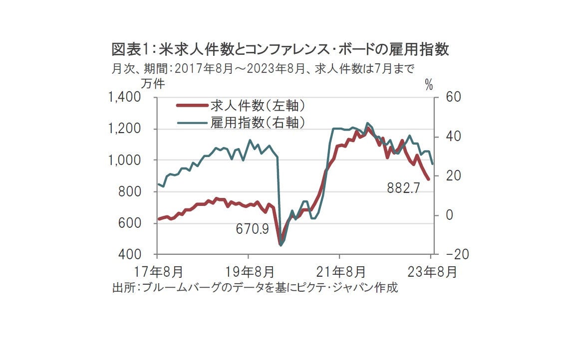 米労働省が2023年8月29日発表した7月の雇用動態調査(JOLTS)によると、非農業部門の求人件数は882.7万件と、市場予想の950万件、前月の916.5万件(速報値の958.2万件から下方修正)を下回りました(図表1参照)。