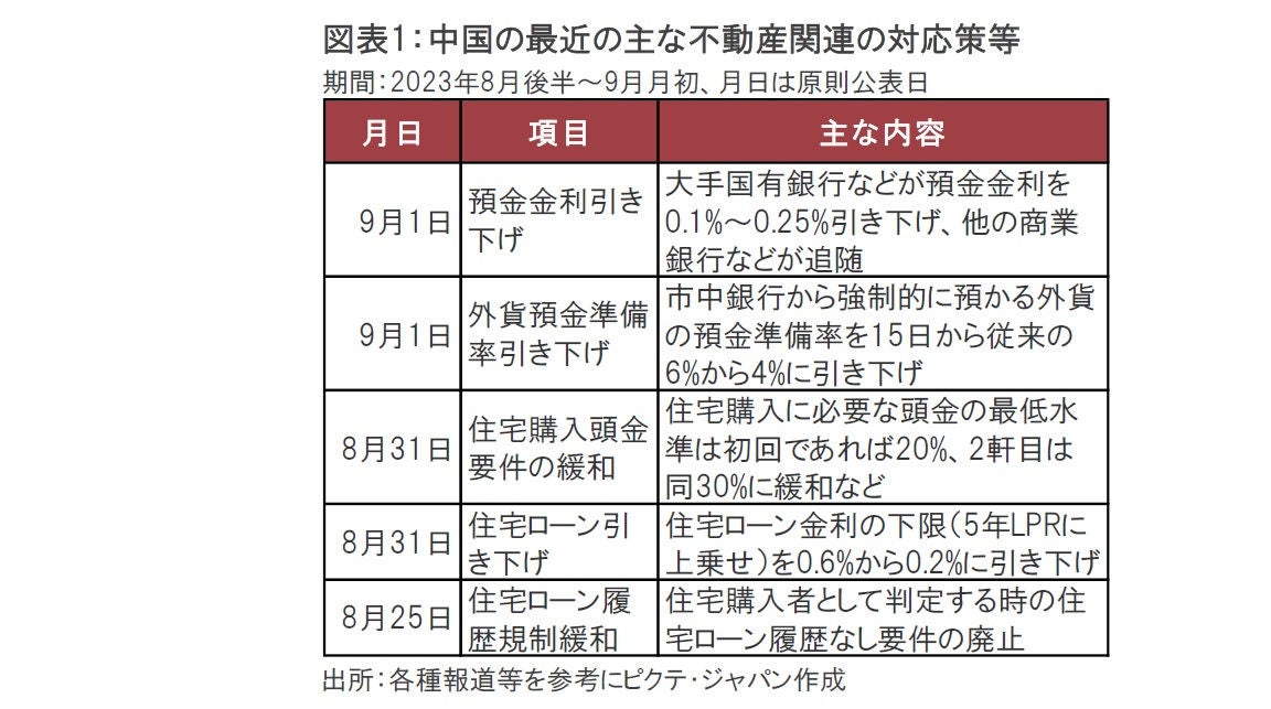 中国人民銀行(中央銀行)と国家金融監督管理総局は2023年8月31日に、住宅購入時の家計の負担を軽減する対策として、住宅購入時の購入額に占める頭金比率を北京や上海などの大都市圏で引き下げました(図表1参照)。また、2軒目の住宅を買う人を対象に住宅ローン金利の下限も引き下げました。