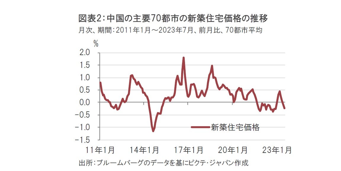 中国の主要70都市の新築住宅価格の推移をみると(図表2参照)、中国では14~15年以前の住宅価格は3年程度の周期でプラス、マイナスを繰り返していました。ある意味、健全な市場であったかもしれません。16年頃から住宅価格は、ほぼプラスと上昇傾向となりましたが、土地投機への懸念などから中国当局は20年にレッドラインと呼ばれた強力な不動産規制を導入しました。これに新型コロナウイルスによる景気悪化も重なり、中国の不動産市場は軟調に転じました。