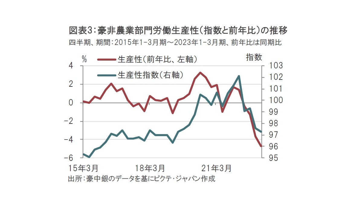 景気回復の鈍さの反面、賃金上昇など相反する事象が原因となって、労働生産性が押し下げられているようです(図表3参照)。なお、豪の生産性は鉱山以外の投資の減少や起業活動が低調なことなどを背景に長期的に低下しているという議論もあります。しかしここで述べている生産性はより短期的なもので、売り上げなどの増加を上回る労働生産コスト(賃金)上昇による生産性の低迷というイメージです。豪中銀の声明文では賃金上昇が物価動向と整合的になる中、生産性の改善を想定しているようです。