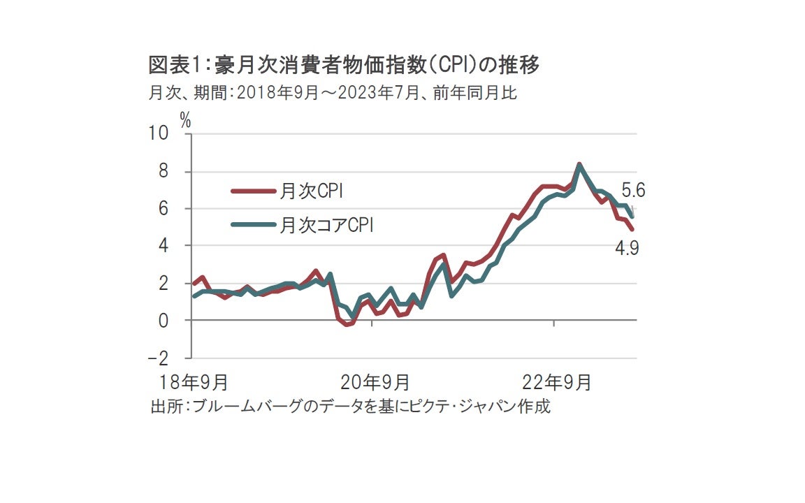 豪中銀は、6月の会合において、その会合前に決定された最低賃金引き上げなどを受け政策金利を4.1%に引き上げた後、7月会合からは据え置きを維持しています。7月会合直前となる6月末に発表された月次の消費者物価指数(CPI)が前年同月比5.6%上昇と急低下したことで、物価減速を見守る余裕ができたためとみられます。今回も会合直前に発表された7月CPIが4.9%上昇と、6月の5.4%から鈍化しました(図表1参照)。