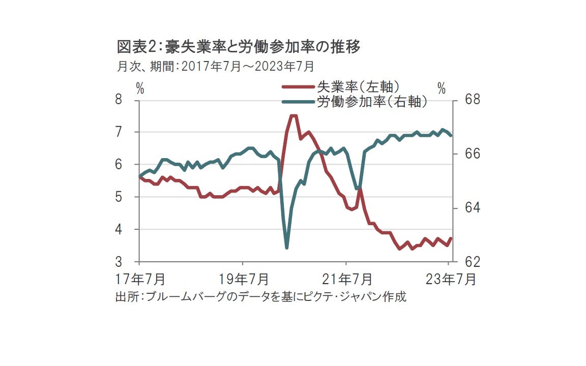 豪労働市場の堅調さは賃金上昇を通じて物価上昇要因とみられます。労働市場への参入度合いを示す労働参加率はコロナ禍前を上回り過熱感がある中で、失業率は低水準で(図表2参照)、物価の上方リスク要因とみています。