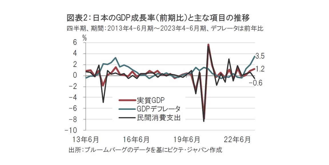 次に、企業活動には改善点が見られました。企業の価格設定や貿易における交易条件などを反映することから、企業の稼ぐ力の1つの目安とみられるGDPデフレータは前年比3.5%上昇と、前期の2.0%上昇を上回っています。4-6月期のGDPにおける純輸出の寄与度が高いこととも整合的です。ただし、労働コストが物価を押し上げるには至っていないとの見方もあるようです。