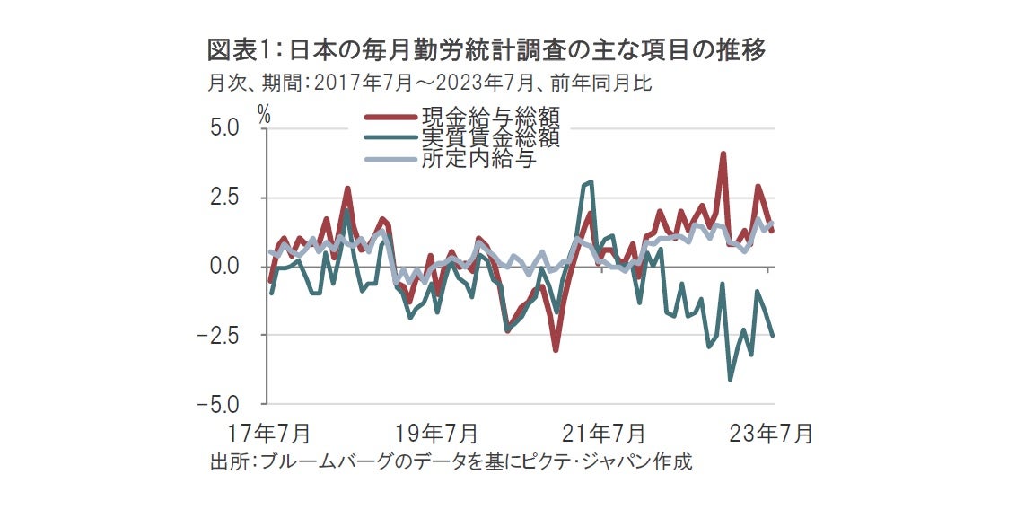 厚生労働省が2023年9月8日に発表した7月の毎月勤労統計調査(速報、従業員5人以上の事業所)によると、名目賃金に相当する1人当たりの現金給与総額は前年同月比1.3%増(38万656円)と19カ月連続で増加しましたが、市場予想の2.4%増を下回りました(図表1参照)。物価を考慮した実質ベースの1人当たりの賃金はマイナス2.5%と減少し、16ヵ月連続、マイナス圏で推移する結果となりました。