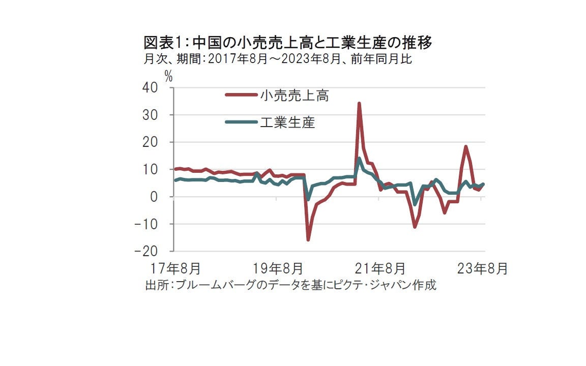 8月の小売売上高に見られたプラス面の1つは外食の動向を反映する食料が前年同月比12.4%増と小売売上高全体(4.6%増)を上回り、ゼロコロナ政策後の消費拡大の動きが継続しているとみられることです。また、裁量消費に分類される化粧品が8月は9.7%増と前月のマイナス4.1%を上回り、宝石も7.2%増と、前月のマイナス10.0%を上回りました。単月の動きで断定するべきではないものの、景気が深刻な状況では通常消費が控えられやすい品目が回復したのは注目に値するとみられます。石油(ガソリン)は6月、7月とマイナス圏で推移しましたが、8月は前年同月比6.0%増と、プラスに転じ旅行需要の堅調さがうかがえます。