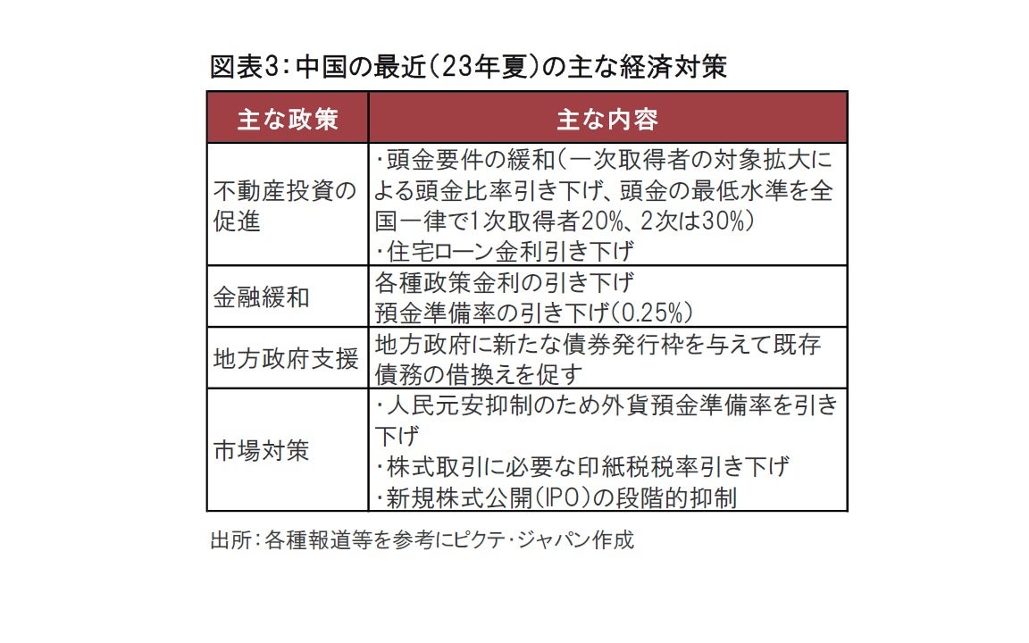 中国の消費や生産活動に底堅さがみられる一方で、不動産市場の回復には時間がかかりそうです。そこで最後に、中国当局の最近の主な経済対策を整理します(図表3参照)。